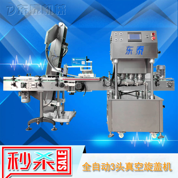 該直線式真空旋蓋機是東泰機械結(jié)合用戶使用的情況,摒棄了傳統(tǒng)轉(zhuǎn)盤式真空旋蓋機的弊端,研制開發(fā)的新型高效設(shè)備,設(shè)備自動檢測到兩個瓶子蓋子進(jìn)入到雙頭真空旋蓋機內(nèi),旋蓋機彩色顯示屏?xí)崟r顯現(xiàn)旋蓋狀況,整機多點檢測,當(dāng)進(jìn)口無瓶無蓋、出口堵塞、定位不準(zhǔn)、瓶身傾倒均自動停機。單個旋蓋頭達(dá)到的真空度都可以單顯示,單調(diào)整