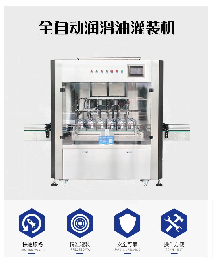該六頭柱塞式全自動潤滑油灌裝機(jī)獨特的灌裝頭設(shè)計及真空回吸系統(tǒng),確保灌裝過程無殘油滴漏,快慢雙速灌裝,灌裝速度可調(diào),杜絕溢瓶現(xiàn)象。