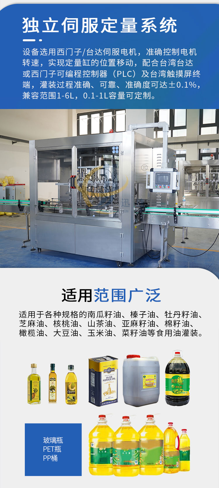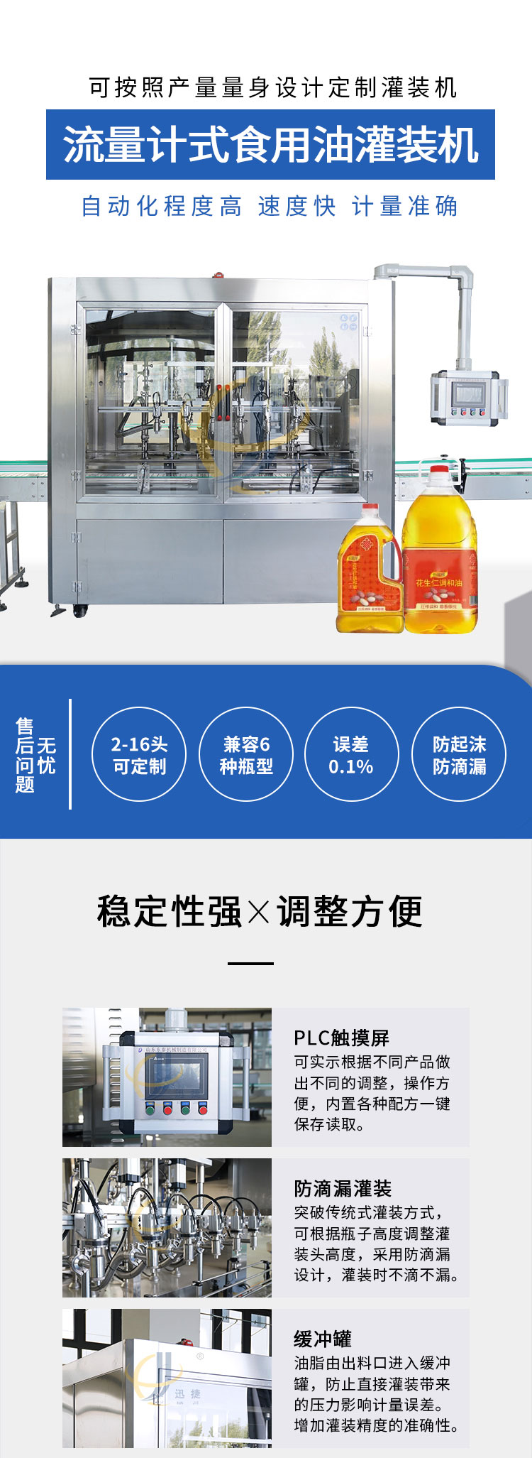 流量計食用油灌裝機(jī)適用于亞麻籽油、菜籽油、大豆油、芝麻油、橄欖油、花生油、玉米油、山茶油等食用油灌裝。