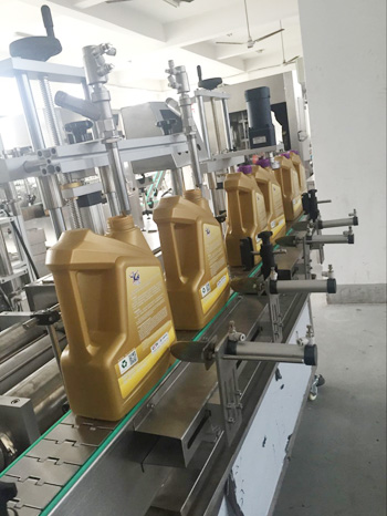 潤滑油灌裝旋蓋一體機(jī)為活塞式計(jì)量方式。計(jì)量范圍為1升-5升,離合式旋蓋結(jié)構(gòu),確保旋蓋合格率高,不傷蓋。本設(shè)備為灌裝旋蓋一體機(jī)