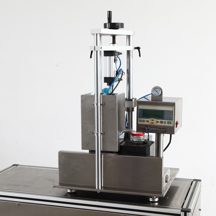 先從個詞半自動來講,半自動指的就是手動與機器相結合的操作流程:半自動玻璃瓶真空封口機是采用了人工上瓶,人工出瓶,機動旋蓋與抽真空的方式來完成流程。由于人工上瓶,并且該半自動玻璃瓶真空旋蓋機有無瓶不上蓋,無瓶不抽真空的特點,所以大大減少了對瓶蓋與瓶身的損害。并且人工與機器的配合絲毫不浪費時間,比純手工的生產(chǎn)效率要幾倍,還更節(jié)省人力,一臺機器只需一個人便可輕松完成。